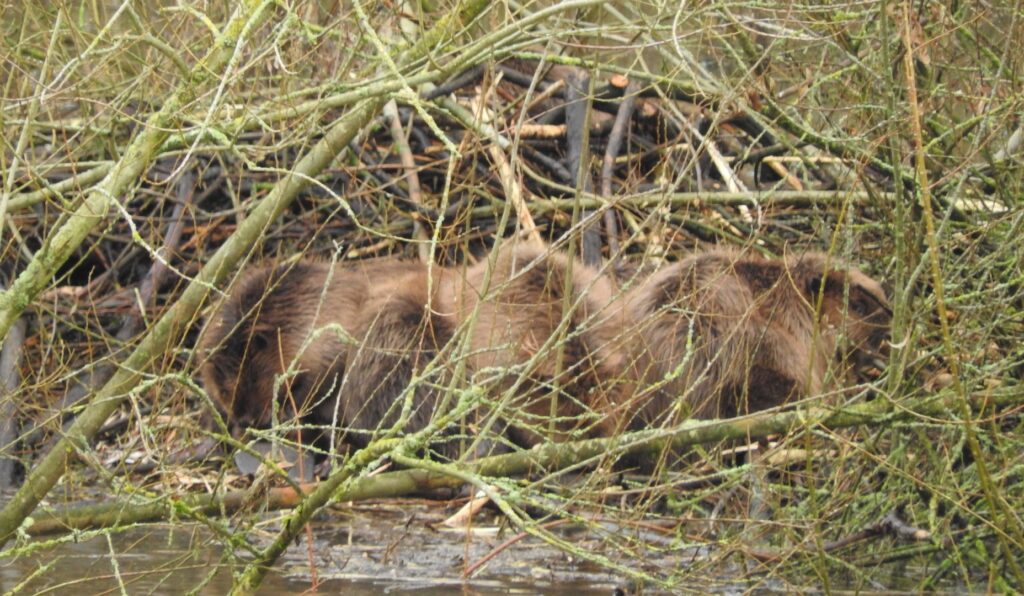 In een burcht leeft een hele familie van soms wel vijf tot zeven bevers. Bij hoog water – als de rivier buiten de oevers treedt – zoeken de bevers een veilig heenkomen op het ‘dak’ van hun burcht met takken. Dat is hier te zien: