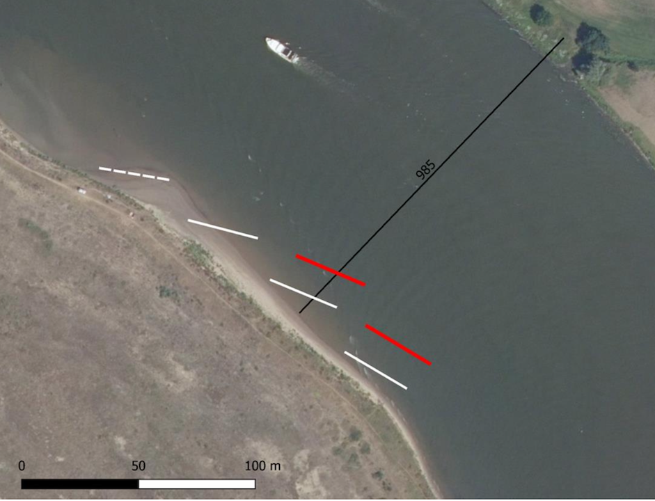 De onderzoekers stellen voor om de proef uit te breiden door 1 of 2 schermen bij te plaatsen richting vaargeul, in de hoop dat het zand uit de vaargeul alsnog naar de vooroever wordt geleid.