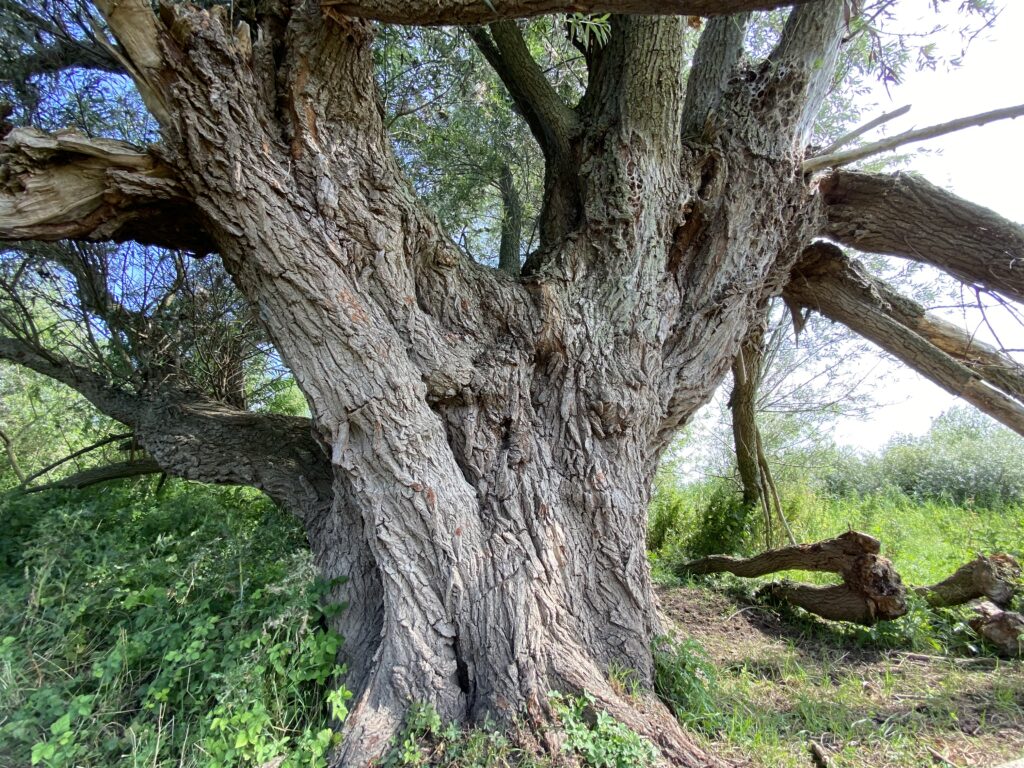 Naast deze dikke kanjer staat nog een bijzonder exemplaar van een hele oude schietwilg. Helaas is daar in het najaar van 2020 brand in gesticht, waardoor de driestammige boom zwaar gehavend is. Of is het toch een blikseminslag die de boom in vlam heeft gezet? Hoe dan ook: een wilg kan tegen een stootje en zal deze aanslag vast overleven.