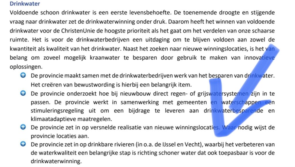 In het nieuwe verkiezingsprogramma voor de Statenverkiezingen in 2023 stelt ChristenUnie in Overijssel dat het provinciebestuur samen met drinkwaterbedrijf Vitens inzet op besparen van en zuinig omgaan met drinkwater. Ook wil de ChristenUnie dat het mogelijk wordt om bij nieuwbouw van woningen opgevangen regenwater in te zetten in huiselijk gebruik. ChristenUnie leverde afgelopen vier jaar een gedeputeerde in het college van Gedeputeerde Staten.
