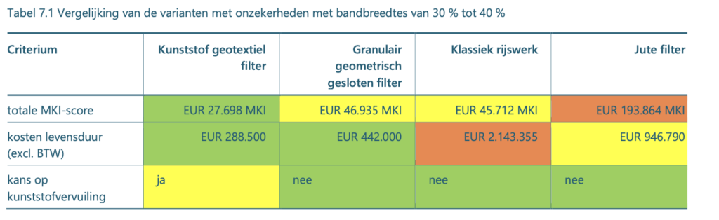 In reactie daarop liet minister Harbers een onderzoek doen naar de duurzaamheid van mogelijke alternatieven. Er zijn drie alternatieven bekeken en de conclusie is dat geen van die alternatieven het qua duurzaamheid en kosten beter doet dan de huidige geotextiel oeverbescherming. Geotextiel gaat 50 jaar mee. Met name jute is na 5 jaar al aan vervanging toe.