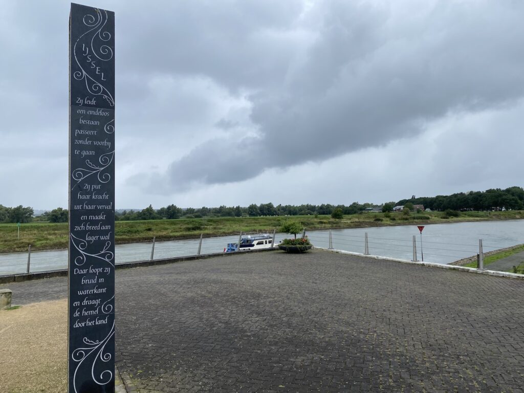Of het nu een bescheide plaquette is op de dijk in Zalk, een gebeitelde tekst op de kade in Deventer of een reusachtige poëzie-zuil in Doesburg: overal langs de IJssel zijn gedichten over de rivier te vinden.