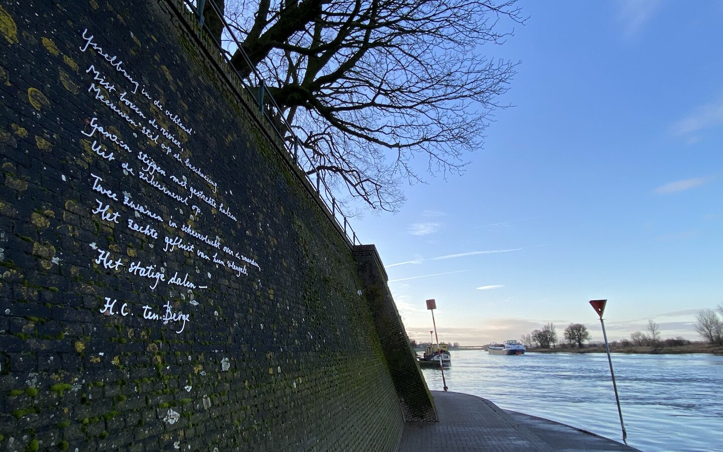 Op de kade van Doesburg prijken twee poëzie-pilaren. Op een ervan staat het gedicht ‘IJssel’ van Harmen Wind.