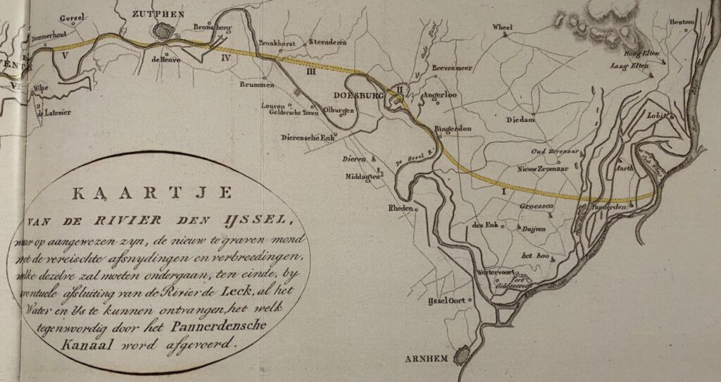 Daarom stelt hij voor om een nieuwe waterweg langs de IJssel te maken: een IJsselkanaal als ‘snelweg’ voor de scheepvaart en om de waterhuishouding op peil te houden. Het kanaal kan dienen als bypass bij extreem hoog water. Met de rode markeringslijn heeft hij het IJsselkanaal ingetekend van Westervoort, via Fortmond naar Kampen: