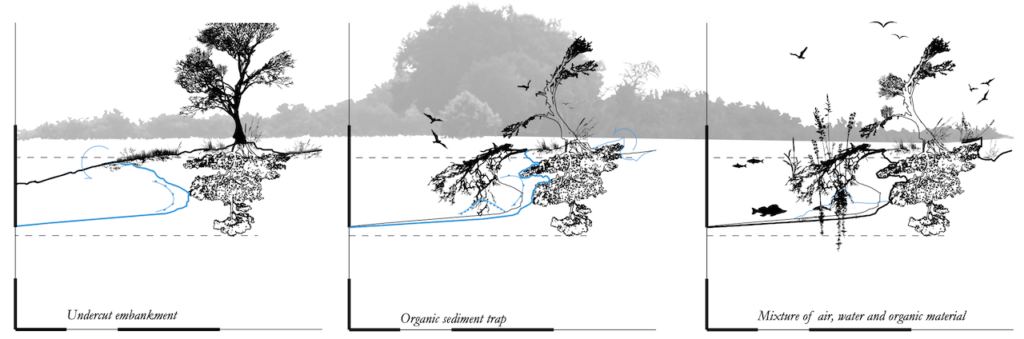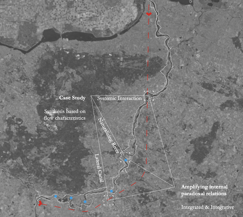 Cas Goselink – inmiddels afgestudeerd stedebouwkundig ingenieur aan de Technische Universiteit Delft – gebruikt deze optelsom van problemen om er een creatieve oplossing voor te zoeken. Zijn stelling luidt: ‘De huidige benadering van klimaatadaptatiestrategieën voor rivieren is gericht op het accommoderen van alle functionaliteiten van rivieren in één enkele rivierbedding, maar loopt tegen de beperkingen van een geïntegreerd ruimtelijk systeem aan.’ Anders gezegd: We willen een meer natuurlijke rivier en we willen scheepvaart en die twee gaan in de toekomst moeilijk samen.