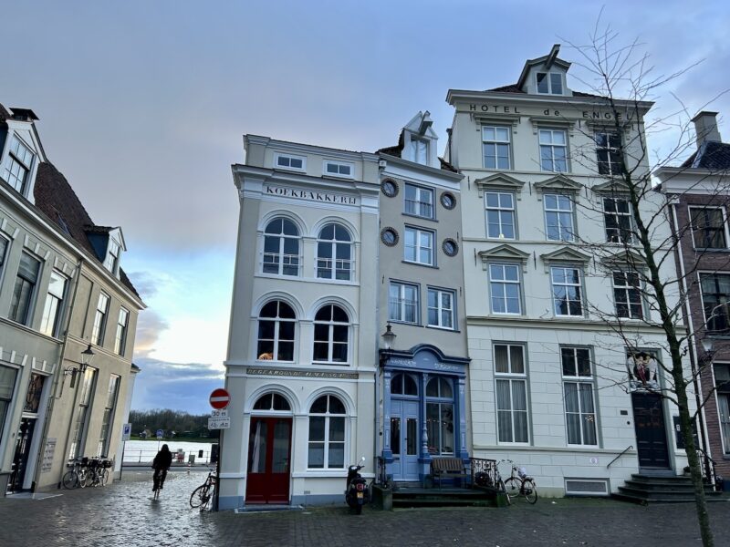 Hotel De Engel aan het Grote Kerkhof biedt onderdak aan het stel. De achterzijde geeft haar zicht op de IJssel.