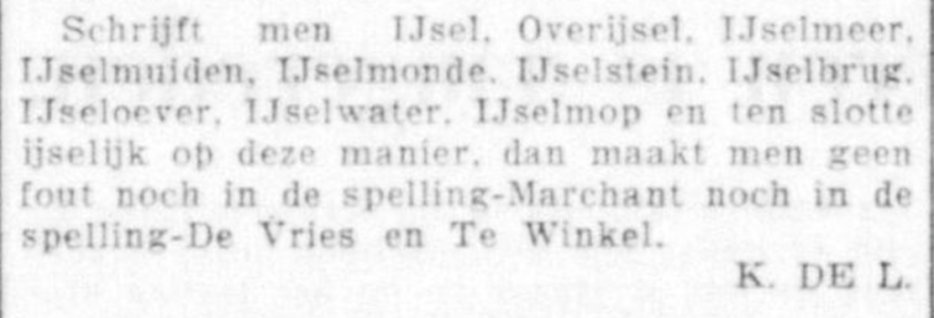 ‘Het is opmerkelijk dat men den naam van de rivier die de oude Romeinen Isala noemden, de laatste tijd in verschillende dagbladen geschreven ziet als IJssel. Waarom een dubbel s? Hoe komt het dat de Nederlanders opeens een min of meer Franse schrijfwijze gaan gebruiken? Het is een aantasting en verminking van onze Nederlandse taal. Dit is een kwaad dat steeds erger wordt.’