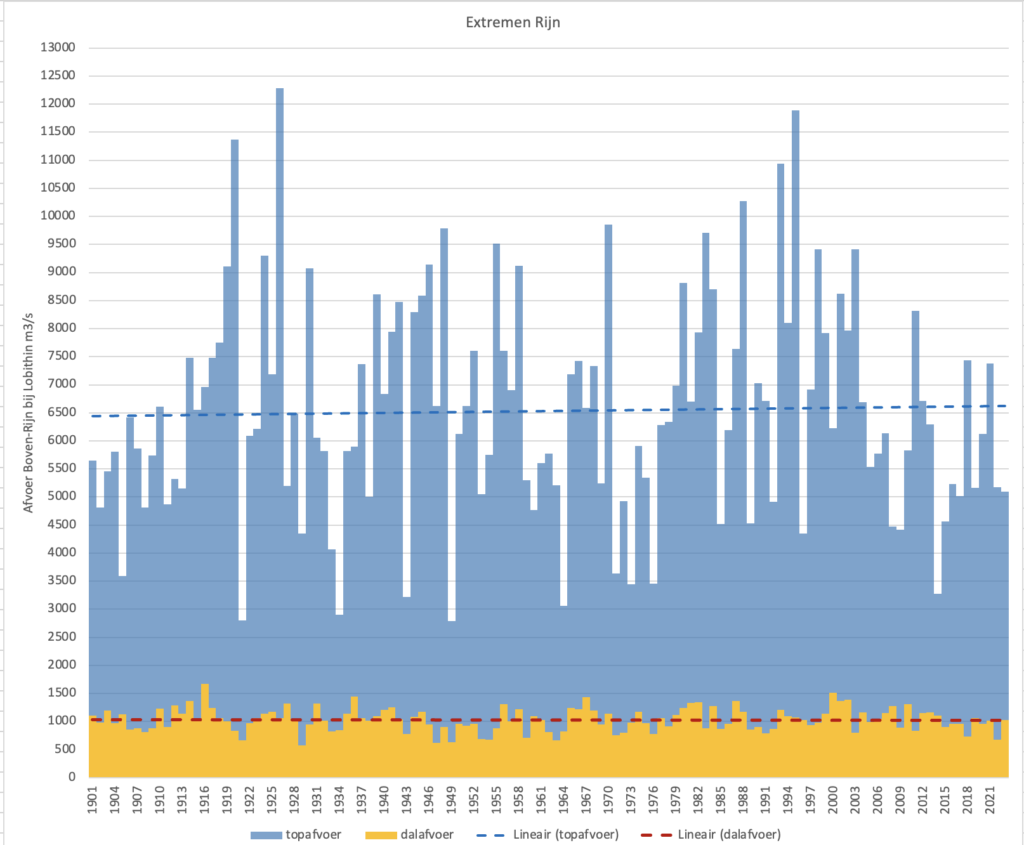 Door klimaatverandering zouden we vaker te maken krijgen met extreem hoge en extreem lage waterafvoeren in de Rijn. ‘Als we kijken naar de afvoergegevens van de Rijn bij Lobith dan is daar voorlopig nog weinig van te merken’, concludeert Van Winden.