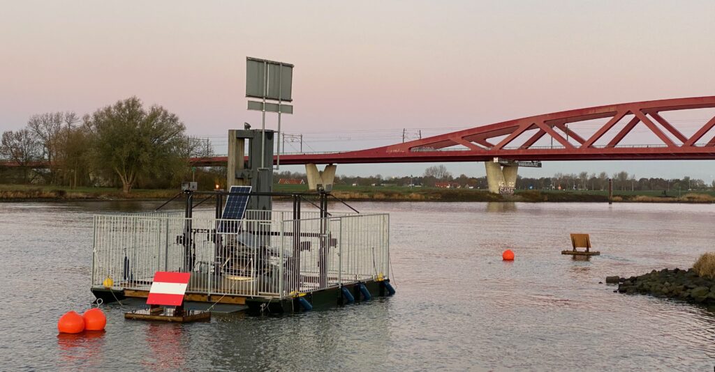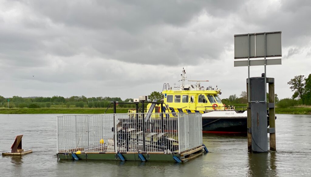 De drijvende mini-waterkrachtcentrale ligt vast aan een meerpaal aan rand van de vaargeul en vormt dus geen belemmering voor de scheepvaart.