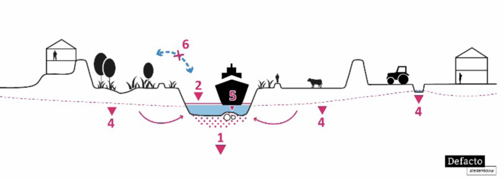 Bij laagwater: 1. Rivierbodem uitgeschuurd en verder zakkend, 2. Laagwaterstanden gezakt en verder dalend, 3. Afvoerverdeling scheeftrekkend, 4. Grondwaterstanden gedaald en dalend, 5. Vaardiepten beperkt, 6. Rivierdynamiek afgenomen (systeembeschouwing IRM).