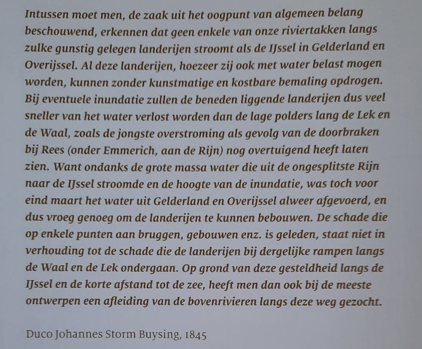 Meer water door de IJssel laten stromen is eigenlijk terug naar vroeger. In het verleden nam de IJssel circa een kwart van alle Rijnwater voor z’n rekening. Het idee om meer water door de IJssel te laten stromen is in 1845 ook geopperd door waterstaatkundige D.C. Storm Buysing (geboren langs de IJssel in Zwolle). Hij was lid van de landelijke riviercommissie en bepleitte om de IJssel een belangrijkere rol te geven in de afvoer van Rijnwater: