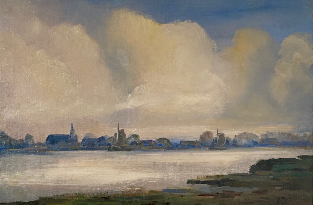 Er iets geks met het schilderijtje. De woningen, het dorpje en de kerk staan onder water. Nu lijkt het water in het dorp door de dijkdoorbraak juist te gaan dalen. De breuk in de dijk lijkt daarom de verkeerde kant op… Fictief dus.