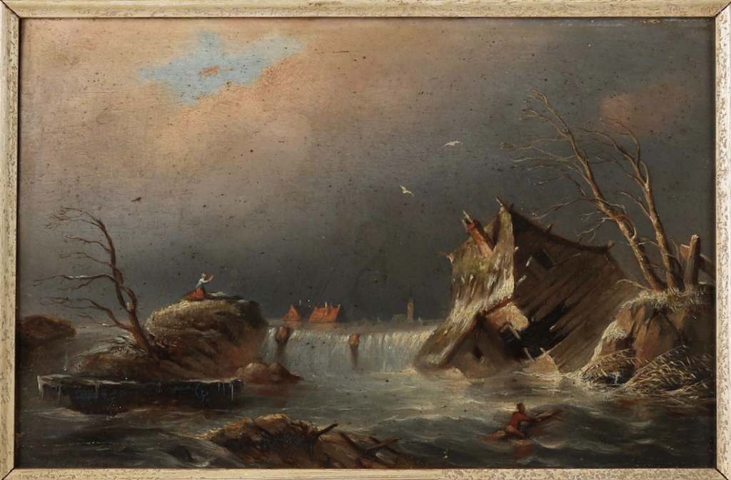Het is een anoniem schilderij dat ik in een opwelling kocht op een kunstveiling. Ik houd van rivieren. In de schilderkunst tonen rivieren vanouds twee gezichten. Romantische taferelen met sfeervolle luchten en een liefelijke waterstroom voeren de boventoon. Minder vaak zie je de catastrofale kant van de rivier afgebeeld.